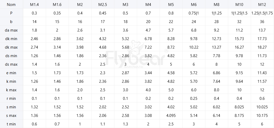 规格尺寸:M1.4-M100
