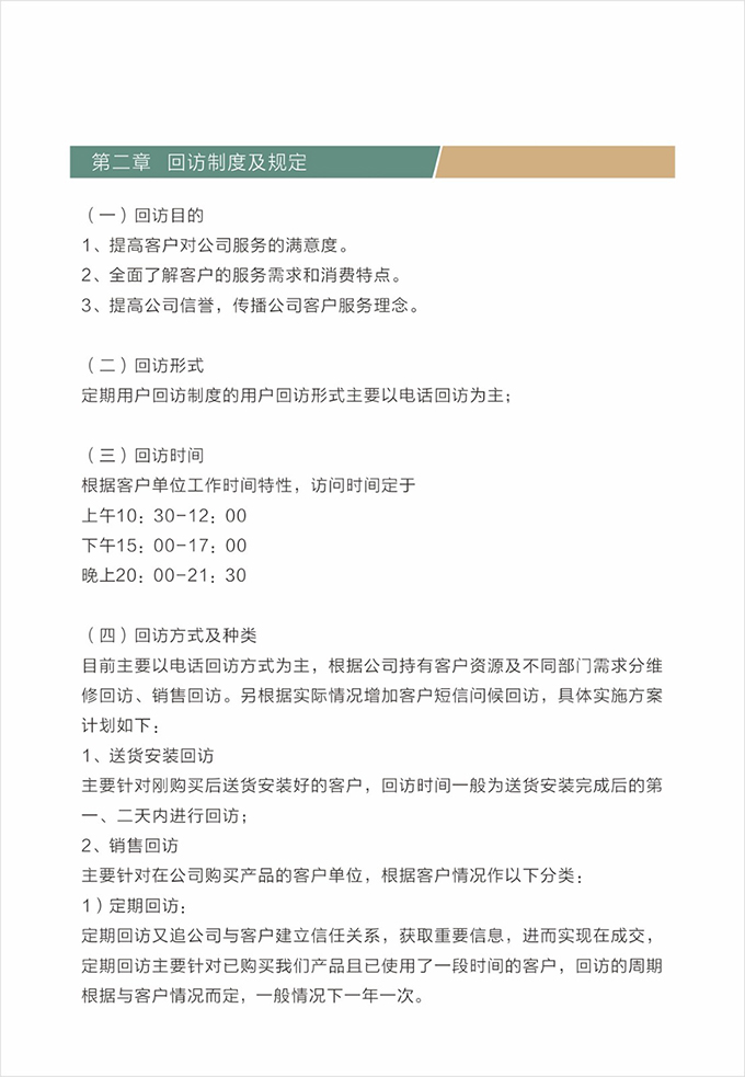 并將有客戶簽名的售后跟蹤單交給店長。店長根據(jù)處理完成結(jié)果登記存檔,并對(duì)客戶進(jìn)行回訪,確定售后處理完成,并了解客戶對(duì)公司整個(gè)服務(wù)過程的滿意情況。作為對(duì)維修處理人員的考核內(nèi)容之一。