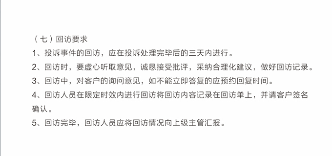 對(duì)客戶禮貌真誠,對(duì)顧客提出的問題,若屬于店內(nèi)公開的范圍,應(yīng)逐條耐心解釋回答,給予正面答復(fù),語言應(yīng)清晰、簡練、肯定;禁止對(duì)客戶搪塞、應(yīng)付、不耐煩甚至惡語傷人教訓(xùn),嚴(yán)禁頂撞客戶;