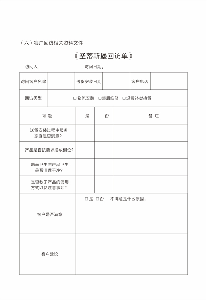 售后人員完成售后,將有客戶簽名的《產(chǎn)品配送單》《配送滿意度調(diào)查表》交給店面經(jīng)理。店面經(jīng)理根據(jù)處理完成結(jié)果登記存檔,并對(duì)客戶進(jìn)行回訪,確定送貨安裝服務(wù)完成,并了解客戶對(duì)公司整個(gè)服務(wù)過程的滿意情況。