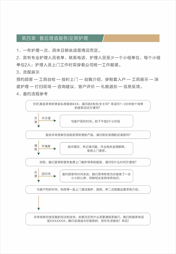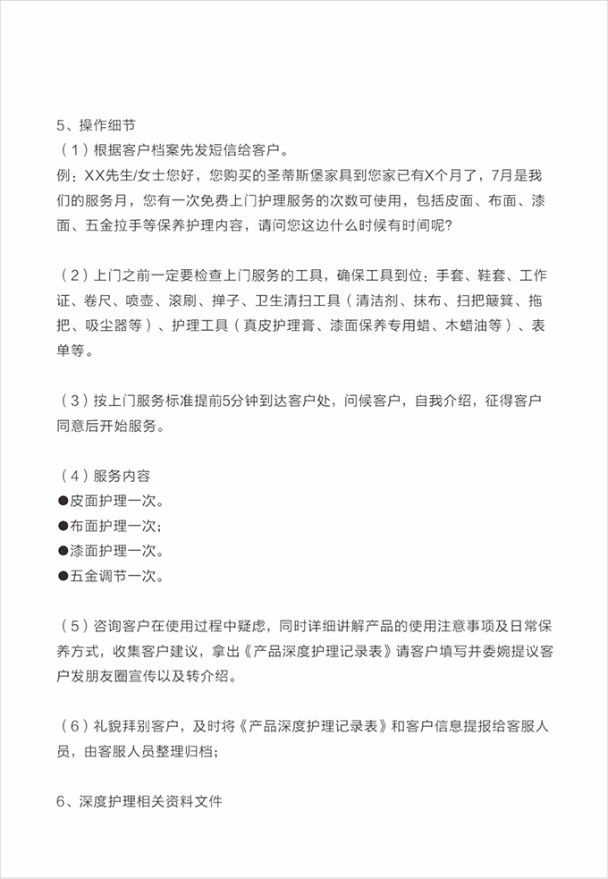 話術(shù)參考:“**先生/女士您好,我是圣蒂斯堡的售后服務(wù)人員**,您購買的圣蒂斯堡家具已經(jīng)全部到貨了,送貨安裝大約需要**時(shí)間,請(qǐng)問您這邊什么時(shí)候方便我們上門送貨安裝呢?”同時(shí)要了解送貨小區(qū)的電梯、樓道、入戶門的尺寸等,提前做好準(zhǔn)備,避免意外情況。最后確定送貨時(shí)間(安裝所需要時(shí)長),并告知客戶安裝人員的相關(guān)信息,可加微信發(fā)送,并發(fā)送配送安裝流程說明。